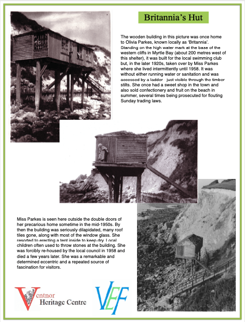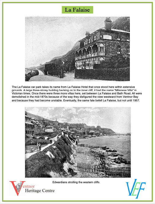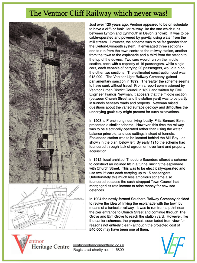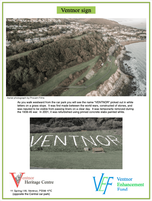 Ventnor Enhancement Fund and Ventnor Heritage Centre have worked together to create several posters to illustrate Ventnor’s interesting history. Six may be found inside the shelter at the entrance to La Falaise car park. A seventh is to be added to the shelter next to The Cascade. They are shown below: